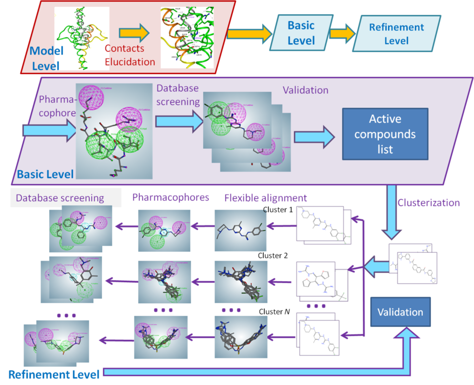 The next step is generation of pharmacophore hypothesis using the consensus features (centers) of compounds for each cluster. Created pharmacophore hypotheses are used for virtual screening of compound databases. BIANA has the databases including around 2 mln commercially available compounds from various countries of the world.